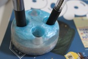 二層に分け、透明と水色を組み合わせて波形のような形で着色したレジン製歯ブラシ、ペン立てです。
